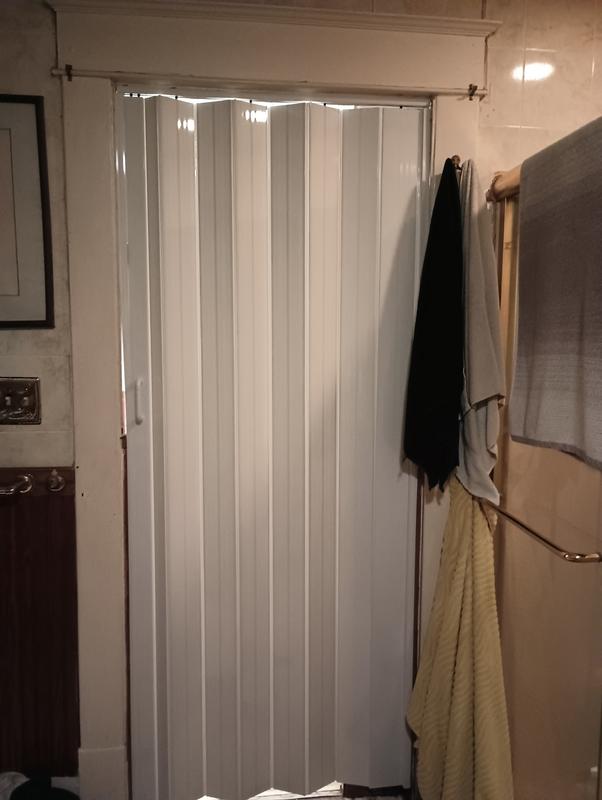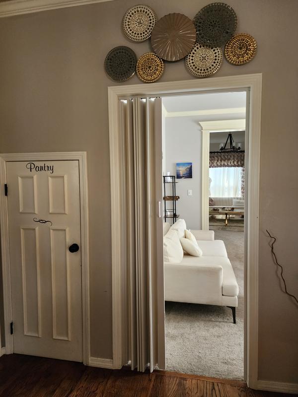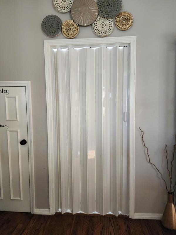 We used this white accordion door in our garage area, in a door in between our work space and play space. The door arrived in a secure box, it was easy to open and install the same day. All of the parts were included and the door works well, it is smooth and does not stick or make loud noises when opening/closing.