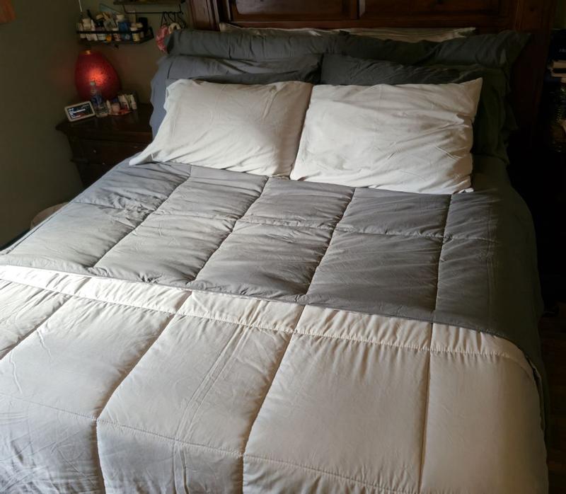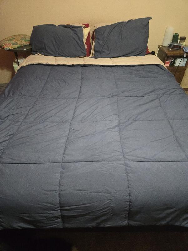 This comforter set is really comfortable if it's the bed very well and I like that. It's reversible, so you can have the blue or the tan color. It's very good quality and it did well in the washer and dryer.