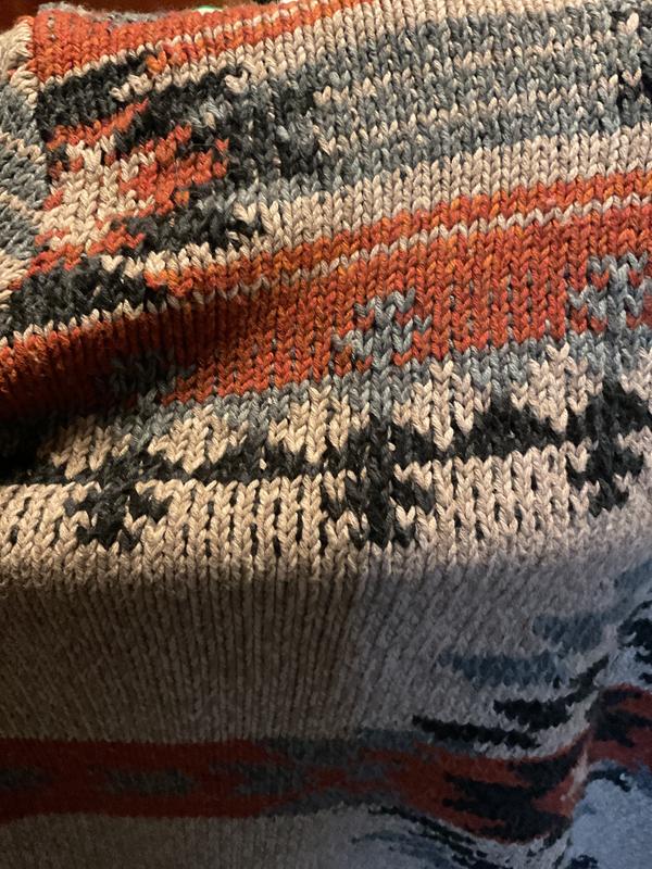 This sweater is heavy, soft and very comfortable. I like the colors and patterns in the design. The sale price was also helpful.