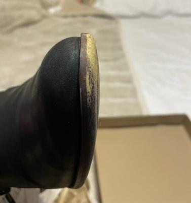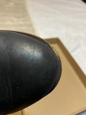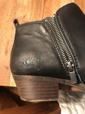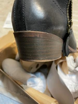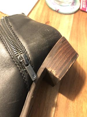 I purchased these one week ago from Dillard's and was excited to wear them. Had them on maybe 2 hours and when I got home I discovered that on one of the heels, the 'stacked' look finish was scraped and peeling off like peeling paint. I did walk a short distance through grass, other than that was driving, then inside when wearing them. I still like them a lot, and will figure out a way to dye the heel.