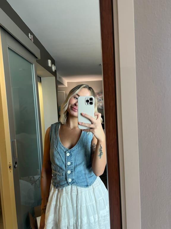 Love that you can wear it just as a top, with a T- shirt, or over a dress. Very versatile! Also like the color of the denim and the fabrics choice.