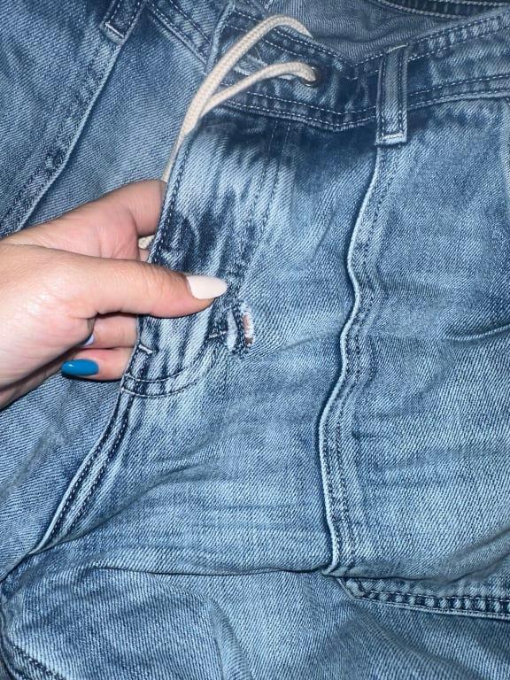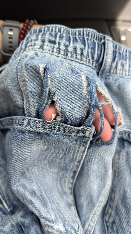 The wash on these jeans is perfection. The style is on point, but there are a few things to clarify - these are cotton & lyocell without any stretch, the weight of the jean is medium, and there is a very little amount of elastic in the waist at the back, but the front is zipper and button closure, with a pull string to tighten if needed. These have a raw hem, so if they are too long, it's easy to snip off the extra length. I bought an XS which is my normal size and they are very very big all over, including the waist even with the pull string to tighten. They don't sit very high because of this, so they are more of a mid rise for me. One size smaller and they would probably fit like the model shown, but I'm going to try to shrink them a little to fit better.