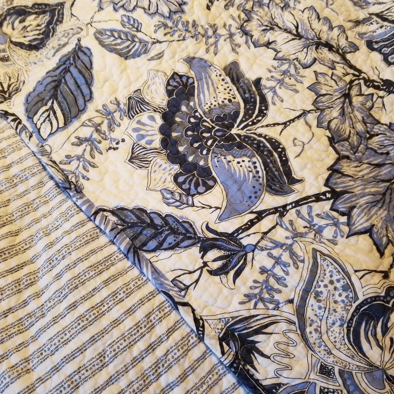 I am in love with this beautiful quilt set. This is exactly what our bedroom needed to brighten up the space and make us feel like we are living in luxury. I love the feel of the material. It was prewashed to soften and it has a very soft, luxurious feel. I am also in love with this design. I like that there is also a design on the backside so when you fold it down, the stripes are a nice contrast -- gives it a slightly different look if you prefer. Blue is also my favorite color and the blue in this set is so aesthetically pleasing. It fits our bed perfectly, too.