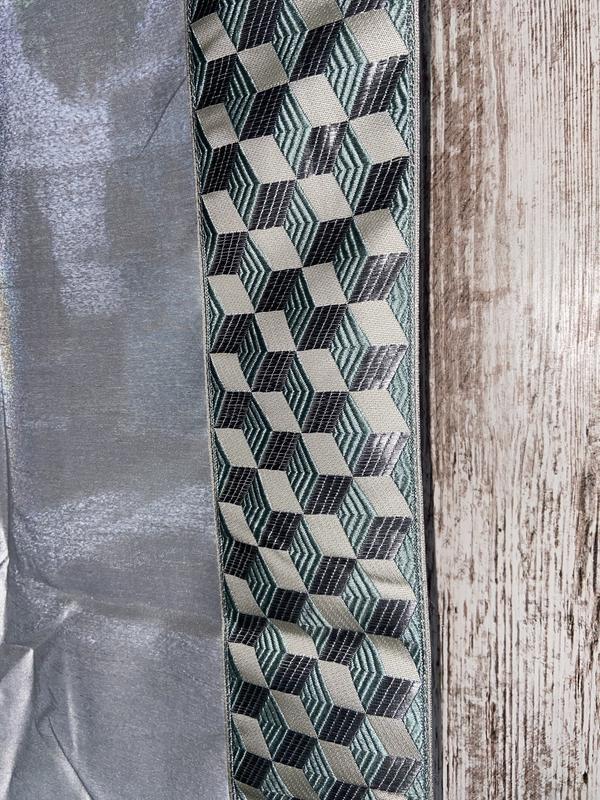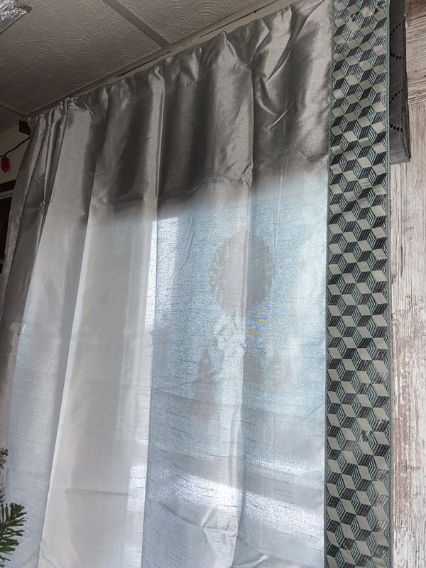 The design is unique in that it has a geometric border running down the edge. It adds dimension to curtain. The faux silk fabric is smooth and nice-looking. The material isn't thick or heavy, so light does filter through.