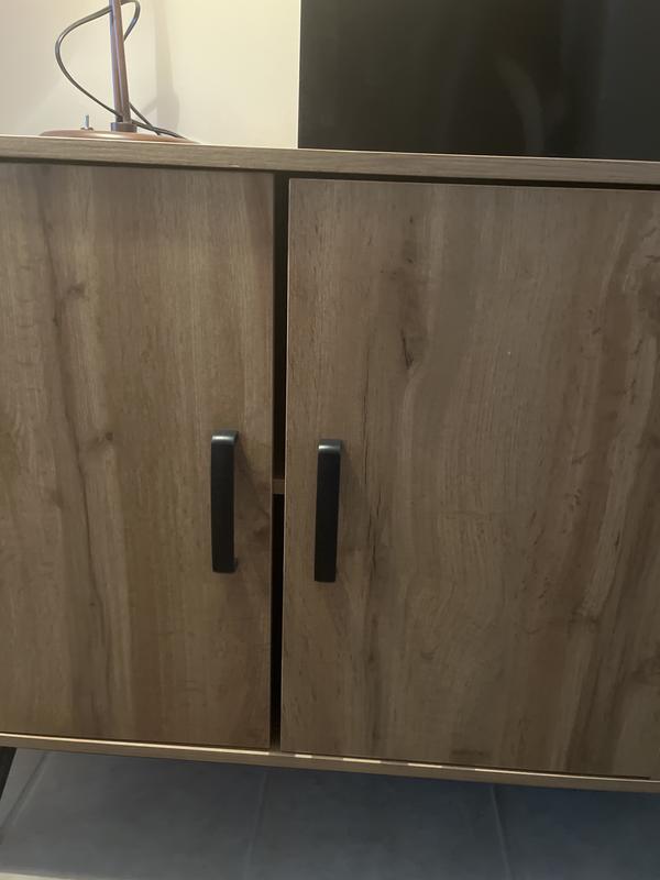 Love the design and how it looks in our living room. Having cabinets to store random stuffs is so convenient. The material is not solid wood, but heavy and study. Assembly is not hard thanks to the very detailed manual book, it will be much easier if you are familiar with drill driver.