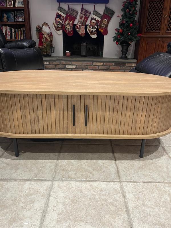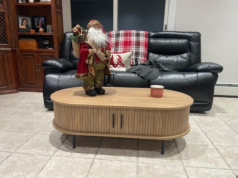 I love the Aria tambour coffee table. It is the perfect size for my den area because of the oval shape. The modern design is absolutely my style. The hidden storage area is a plus for a clutter free space.