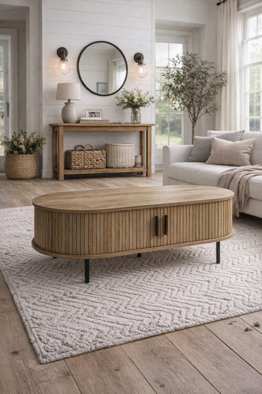 LuxenHomeStandard Wood Slatted Sliding Doors Storage Mid-Century Modern Oval Coffee Table