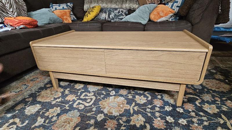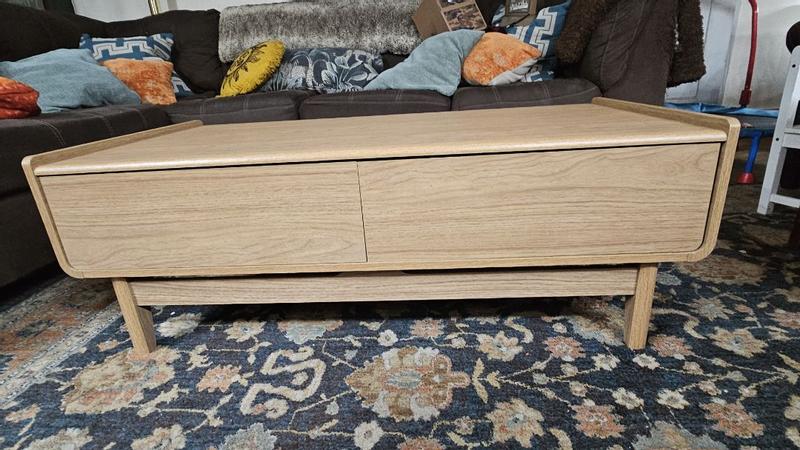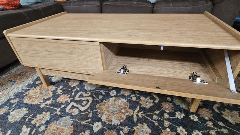 This was my very first time ever assembling a piece of furniture, and I was a little nervous going into it. The directions were super clear though, and once I trusted the process, it all came together beautifully! Honestly, I surprised myself with how nice it turned out. The table feels really heavy-duty and sturdy, not flimsy at all, and it gives the room such a warm, polished look with the oak finish. It also came really well-packed for delivery. Nothing was scratched, dented, or damaged, which I really appreciated. The folding storage doors are such a standout feature. They’re push-to-open with an anti-slam soft close, so they feel super high-end every time I use them. Plus, the hidden storage is a total bonus. I love having a place to tuck things away while still having a stylish centerpiece in the living room. If I had to pick one tiny downside, it’s that the connectors on the fold-down openings are white nylon straps. They’re not the prettiest, and mine came in slightly different lengths so the doors don’t fold down perfectly evenly. It’s a little quirky detail that only I notice, so it doesn’t bother me too much. Overall, I couldn’t be happier with this coffee table. For my first build, it was a total win, and I’d absolutely recommend it to anyone looking for something sturdy, functional, and surprisingly high-end!