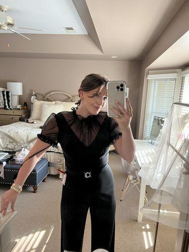 I bought this jumpsuit in white t for my Marriage Blessing Ceremony that took place in our Catholic Church. It was perfect for the occasion. I love the high neck, cap sleeves, gold detailed belt & material. I got so many compliments. The jumpsuit is very long, but I'm only 5'4". So I did have to have it hemmed. I also had to have the belt adjusted because it was too loose.
