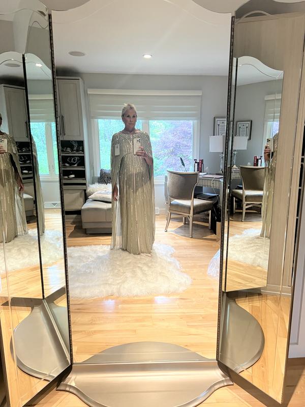 Allover Sequin Embellishment Floor-Length Column Fit Dramatic Cape Overlay