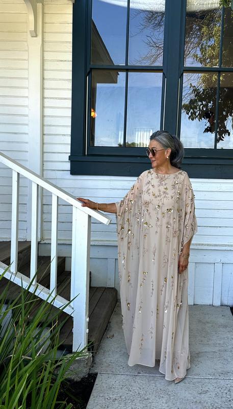 This elegant beige trapeze dress features a flattering boat neckline, flowing caftan silhouette, and intricate 3D floral embellishments. Effortlessly sophisticated, it's the perfect choice for weddings, luncheons, or any stylish special occasion.
