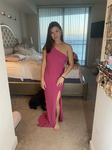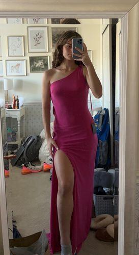 This dress was a bit of a splurge but wow! Totally worth it. The material is so nice and the dress itself fits me perfectly. I listened to other reviews and sized down (usually a 2, got the 0) and couldn’t be more happy. I’m 5’6” 125lbs. and with 3-4 inch heels the dress falls perfectly at my feet. The back of this dress is gorgeous, actually every angle is flattering. Excited to wear this to my cousins summer wedding!