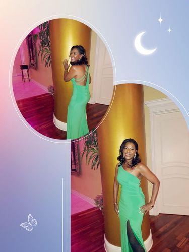 Gorgeous color and style. The flow of the dress is luxurious. Wonderful option for prom, ball or wedding. Timeless classic fit.