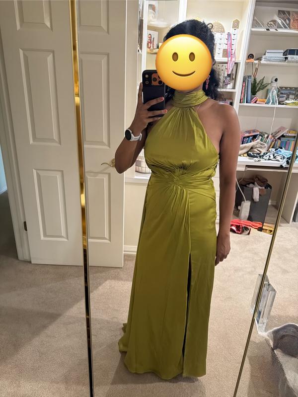 The proportions of this dress did not work for my body type. I have a long torso, which caused the draped waist to sit way too far up. The halter neck was also extremely tight. The quality of the dress was also very poor. There were raw, unfinished frayed edges underneath the pleated draping. Overall, I expected better for the price of this dress. The color Ocean was beautiful, but I’ll be returning this dress and looking for something else for my upcoming event.