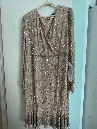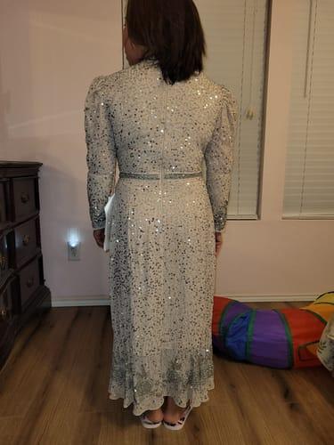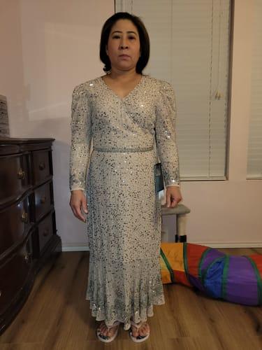 Purchased size 20 based on measurement guide for my wedding in 2024. I'm 5'5" 190# I love the cut and fabric of the dress. It just sparkles and photos don't do this dress justice. But it's absolutely too long! I was standing on a step stool and it hits the floor. It will need a large amount of alterations at the shoulder and length. I'm a middle age bride and did not want a white dress. This is exactly what I wanted. Looking forward to walking down the aisle in it post alterations.