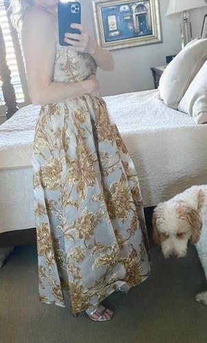 The Gold Strapless Brocade Midi Dress is absolutely stunning. When I tried it on I felt like a movie star. The dress is exceptionally made and requires minimal alteration for my petite frame. I brought the dress for a special occasion, that has not yet occurred, but I am sure that it will definitely turn heads.