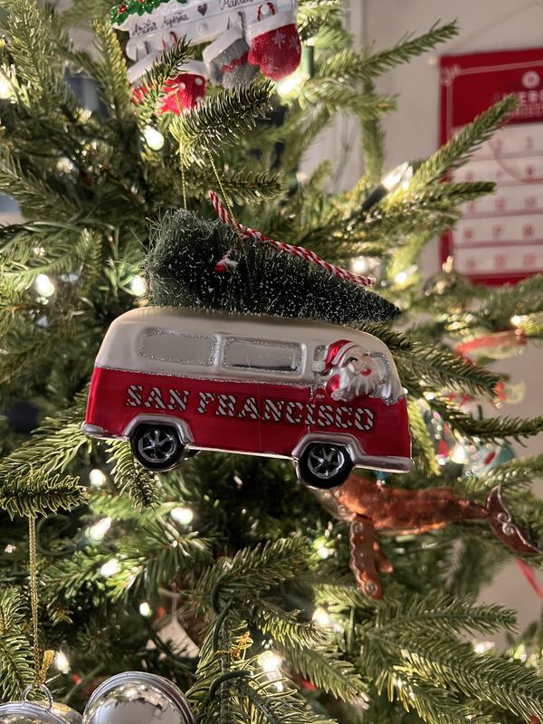 San Francisco or bust! Adventurous Santa takes to the road in this delightful Macy's ornament, featuring glitter accents and a holiday tree tied to the roof of the bus.