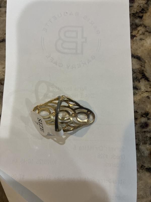 I thought wow this so cute. Then I noticed the ring was tarnished on both sides. So disappointed.