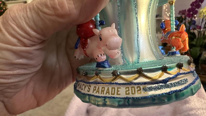 Trimmed with glitter and sparkling beads, topped with a Macy's metal logo charm, and dated 2025, this glass carousel ornament celebrates the Macy's Thanksgiving Day Parade.
