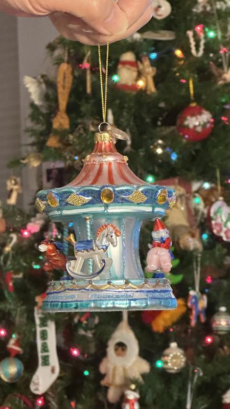 Our carousel ornament arrived with a broken and missing piece on top and the year 2025 on the front had the 5 painted over with blue glitter. Returning!