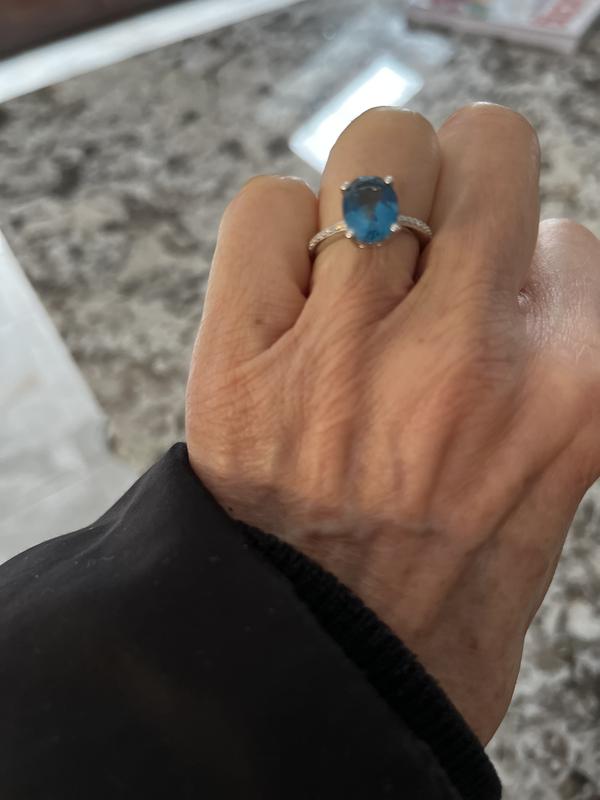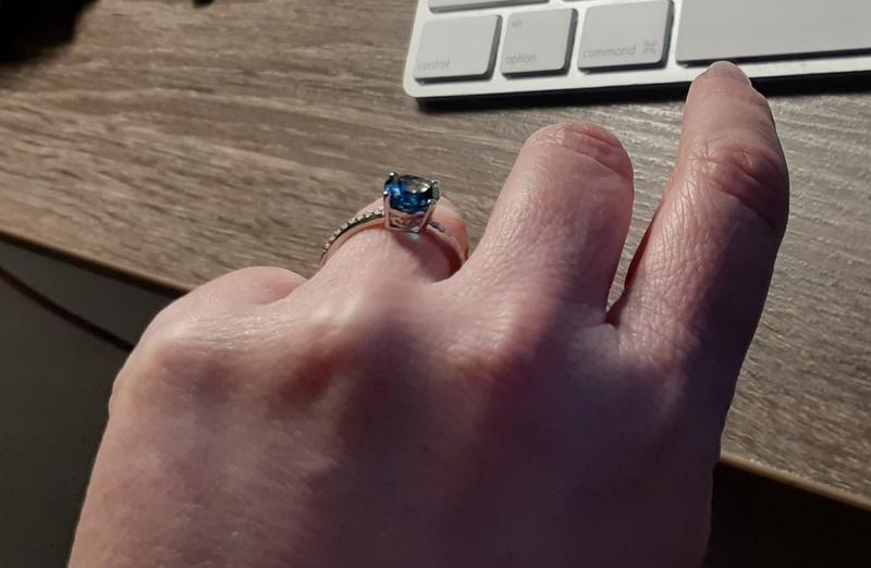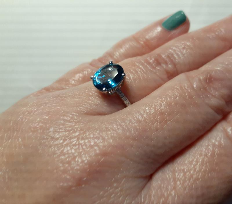 Such a stunning ring. The blue topaz is absolutely gorgeous and so is the dainty band with the diamonds. I am so impressed and the price was excellent.