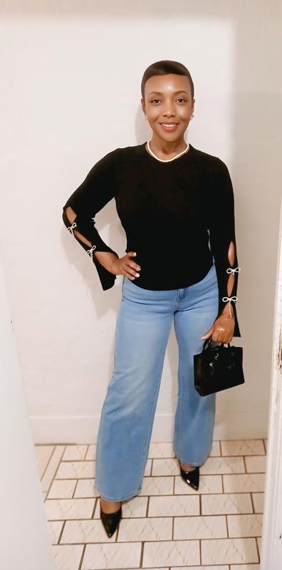 This sweater is such a standout piece. The cut-out sleeves with the sparkling bows add a really unique and stylish touch without feeling overdone. The material is soft and comfortable, and the fit is flattering and true to size. It feels well-made and looks even better in person. Perfect for dressing up a casual outfit or adding a little sparkle to a night out.