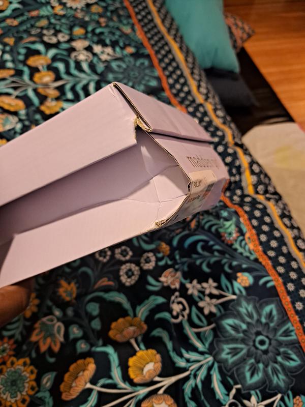 I received the package and when I opened the package it looked like someone was playing kick ball with it. Also the left shoe has a scuff mark on it, and it looks like someone has worn it. I am not pleased with this purchase, and I will be returning it.