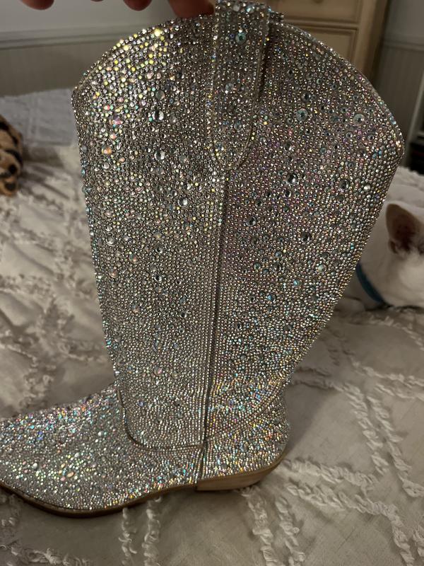 these boots are so pretty......i ordered them online and the right boot fit perfectly and the left boot i could not even get on my foot.......also, there were a few places where the rhinestones were coming off.....i returned them.
