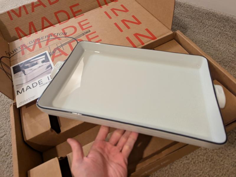 Love this baking slab. It bakes beautifully, heating so evenly. Clean-up is a breeze. Just soak a few minutes and all the baked on material lift right off. Love the design and it matches my other Made In dishes. Made in France and so wonderful.