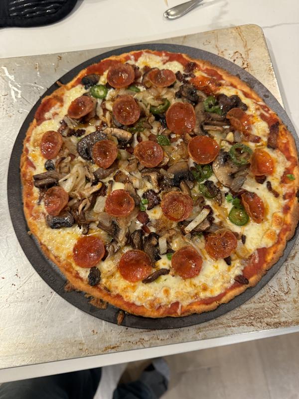 Hey Pizza lovers! Whether a frozen pizza or homemade, cooking a pizza has never been more satisfying! This carbon steel pizza pan helps heat the crust evenly! Love it!