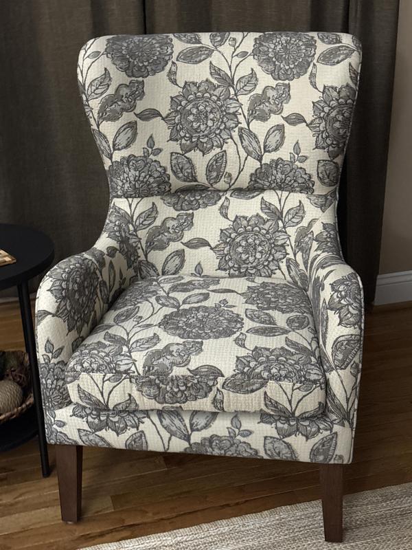 We were a little Leary about ordering this chair online without seeing it, but were very pleased when we received it. The beautiful floral print and colors are a perfect addition to the room. The light blue color, as mentioned in the description online, is so light that it appears more gray from a distance, but still very pretty. It’s the perfect accent chair, but not a comfy sitting chair for an extended period of time. It’s a narrow chair so would fit in a smaller space. I would highly recommend it and the fabric is pretty too.
