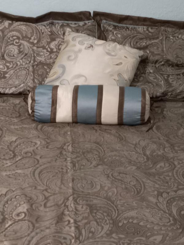 This is a nice looking bed set. It comes with 3 throw pillows, 2 shams, and the duvet cover. It is well made and the stitching looks tight and great. The colors flow nicely together and it is versatile to match many styles of decor. This set will be used in the guest room since it looks very welcoming.