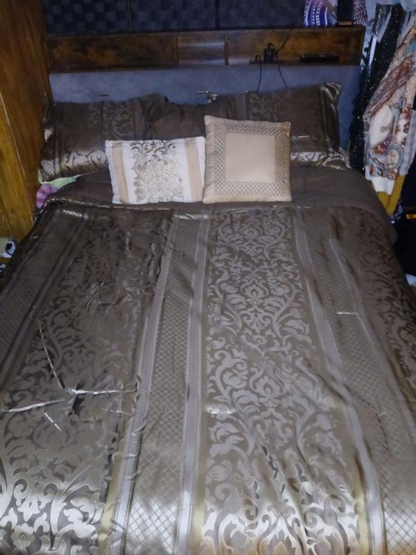 This comforter set has great quality! And made my room stand out so much. I loved how the blanket is the perfect thickness to keep me warm but neither so thick and heavy or too thin where it doesn't keep me warm. Is amazing! Also the diferent types of brown this comforter set has is beautiful and gives like royalty old times vibe. It comes with 6 pieces and saved me so much time looking for pillows and things im completely impressed because with only this 6 pieces I feel like the bed looks almost complete. Definitely worth the price