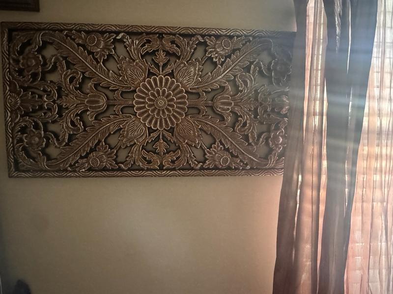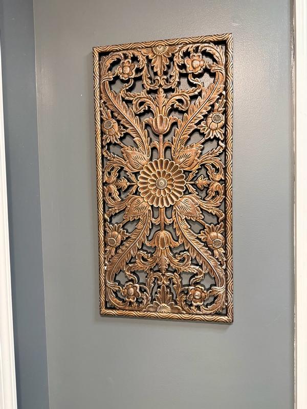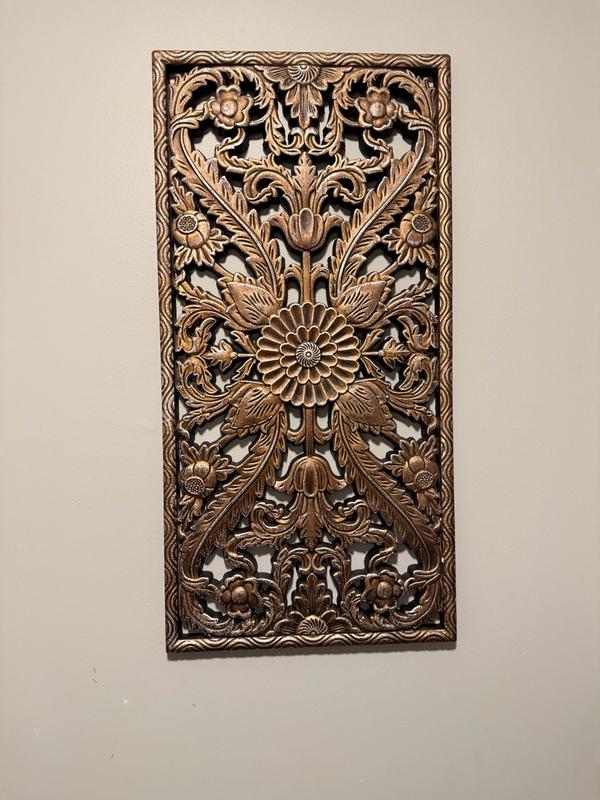 This is a really sturdy and also heavy at the same time panel carved wood wall decor. Very elegant and very easy to install. It fits perfectly in my living room.