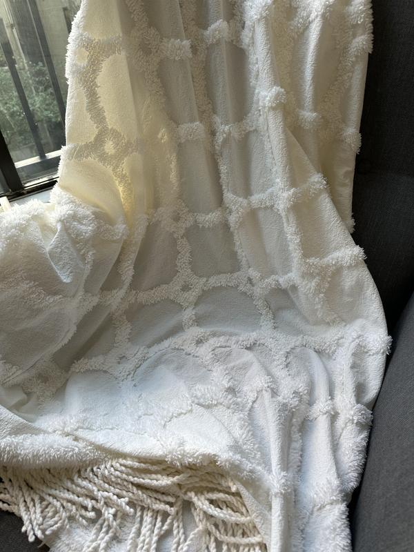 I love this Brianne chenille throw! First off, it is 100% cotton and lightweight. Perfect for when you just need to be a little cozy without getting too hot. The color is like a light peach. The chenille fabric is a favorite of mine. I also have a chenille bedspread so this is perfect for my bedroom. It has a 4 inch fringe on the edges. It is so pretty! I would definitely recommend this beautiful throw.