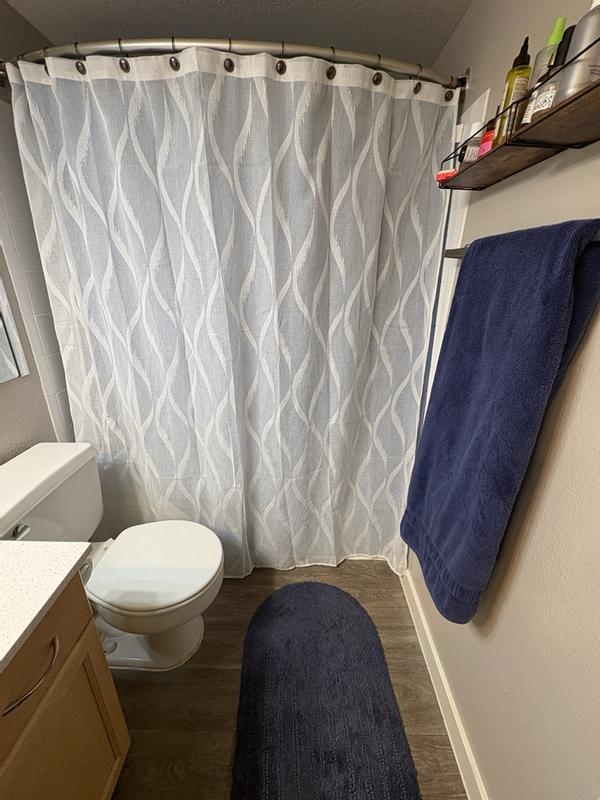 It’s a pretty shower curtain that helps you dress up your bathroom. I purchased a separate fabric shower curtain liner in a light blue color that still goes well with the other navy color bathroom rug and navy towels. It’s the perfect size in my standard shower in my apartment. You will need a shower curtain liner with it in order to be effective. I chose to use one with color to peak through the detailed sheer fabric.