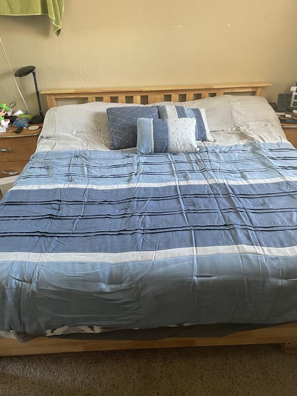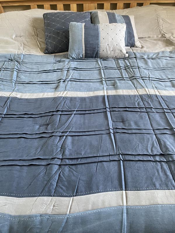 The Madison Park Saban 7-pc. Comforter Set is so beautiful and comfortable, it really lights up your room. The combination of light bue, medium blue and gray make your sleep space so comfy, calm and just gorgeous! The set comes with 7 pieces that includes the comfortor, solid blue bedskirt , 2 pilow shams and 3 decorative pillows. The set has a faux-suede look but it is light-weight and has the most precious pleted design in the pillows and comfortor. The shams fit perfectly with my standard size pillows and the decorative pillows fluffed up beautifully right out the box. I have the queen size comfortor which is 90x90 and fits my bed very well top to bottom and side to side. The colors match my room and decour perfectly. I'm very pleased with this set.