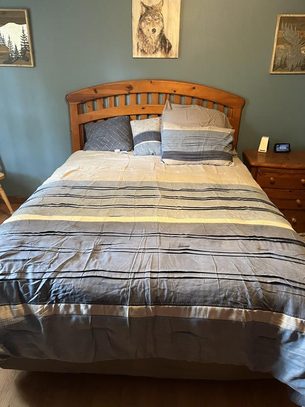 I really like the look and feel of the comforter and pillows. Soft, not to heavy or light, and easy to care for.