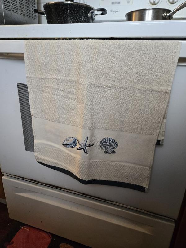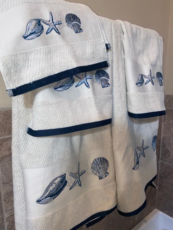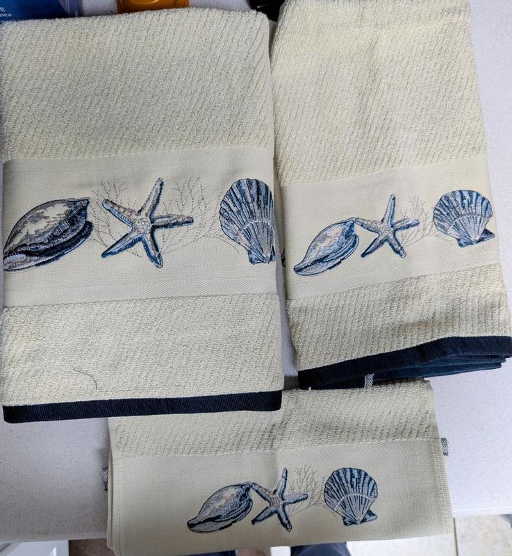 I love the thickness of this set. They did not fade after the first wash. They still look great even after using them. They did shrink just a little bit, but not enough to worry about. They are still a very nice size. They are very absorbent when used for drying. The embroidery also looks quite nice. I love the nautical/sea shell theme.