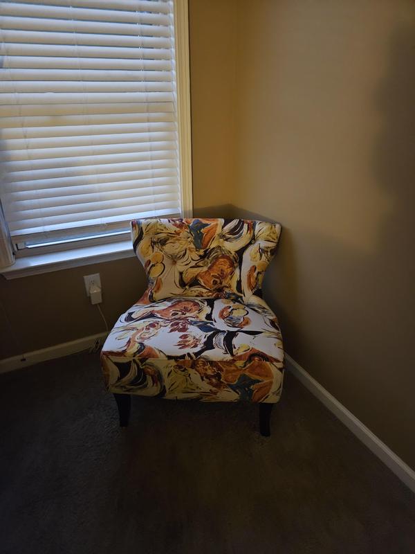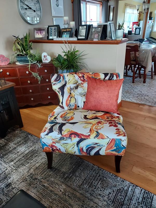 Love the colors and size of thir beautiful accent chair. I have chocolate brown leather sofa and chair with orange and yellow accents in my living room. This chair is perfect in the room. I love it.