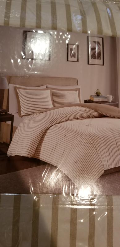 This is a very nice and a very light weight comforter. It can be reversed to reveal a solid side or a striped side. It washes up very nice and dries fast. The only disappointment is that I B thought it would be heavier but it would be perfect for summer months.