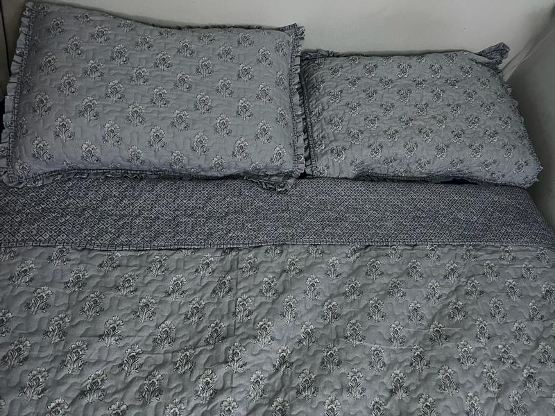This quilt set is perfect for my guest room! The color and the pattern is very calm and welcoming. Looks very durable and easy to take care of. It’s polyester so no wrinkles. I am very satisfied.