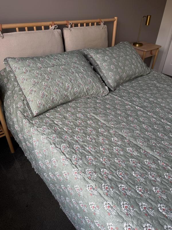 Dear Customer, thank you for your feedback. We’re truly glad to hear that the Madison Park Linwood Ruffle Printed Quilt Set was a great match for what you were looking for in terms of style and design. That means a lot to us, as this set is loved for its beautiful print, soft feel, and charming ruffle detail that adds a fresh, elegant touch to any bedroom. We are very sorry, however, to hear about the stitching issue you discovered. An 18-inch unsecured thread with no stitching in between is absolutely not the level of quality we expect, and we appreciate you marking the area so clearly. Your attention to detail helps ensure concerns like this can be properly addressed. We understand how disappointing it is when quality control falls short, especially after you were otherwise happy with the set. Your feedback is very valuable and will be shared with our team to help us improve our products.