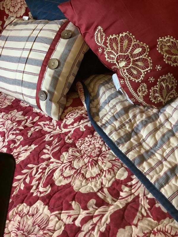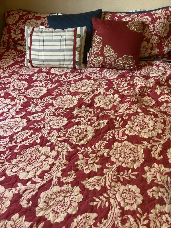 We just love the look and feel of this traditional 6-piece reversible Madison Park quilt set. The floral side is beautiful with dark red and cream and dresses up any bedroom. The striped side of the bedroom compliments any formal or guest room with throw pillows to complete the full set. The comforter is light and stitched so beautifully. We highly recommend Madison Park and this beautiful Lucy style!