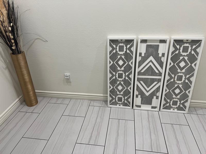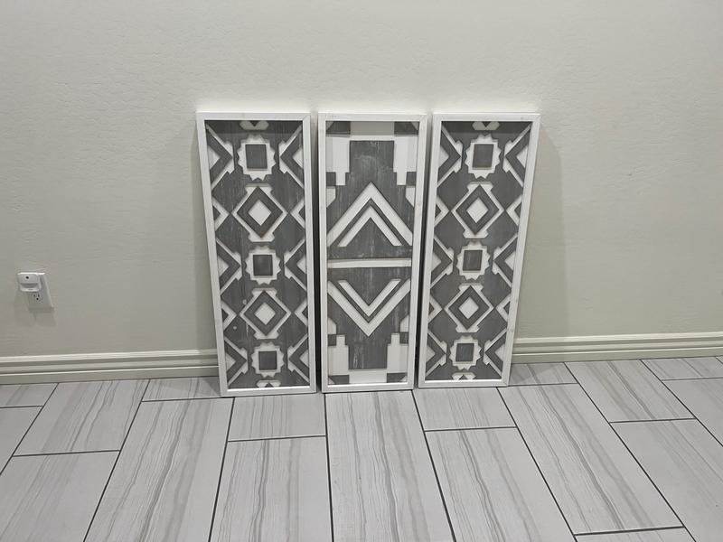 Absolutely love this wall decor set! Very rustic chic. I believe the piece is prettier in-person, too. Happy with the way the material is structured and that each piece comes with four hooks for easy hanging. Also, I like that there are different options for placement. Such as vertical, horizontal or even by singular panels. Can't wait to hang this above my bed!