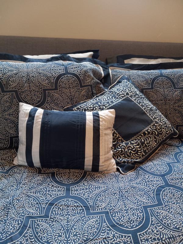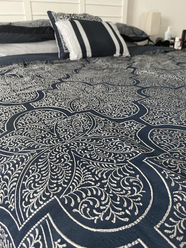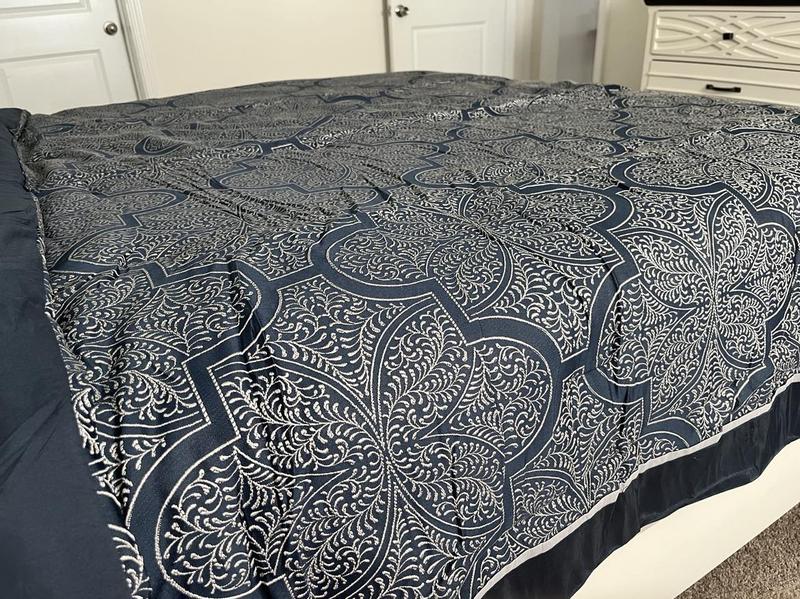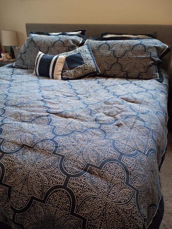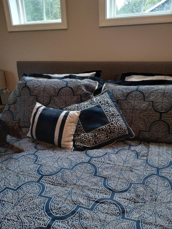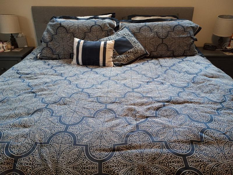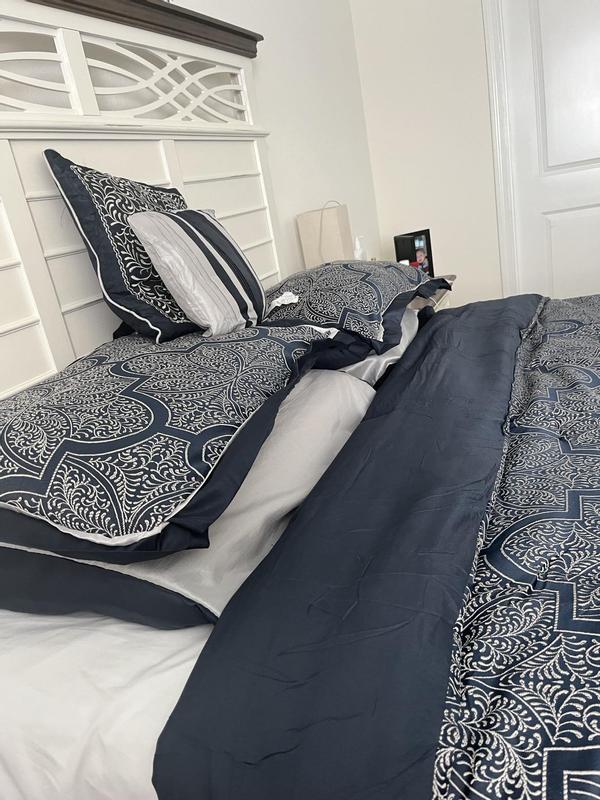 Beautiful comforter set, Navy and Silver. This sets looks a little masculine, but at the same time elegant. Nicely made, thick but not too heavy. Great deal with all the shams and extra pillows.