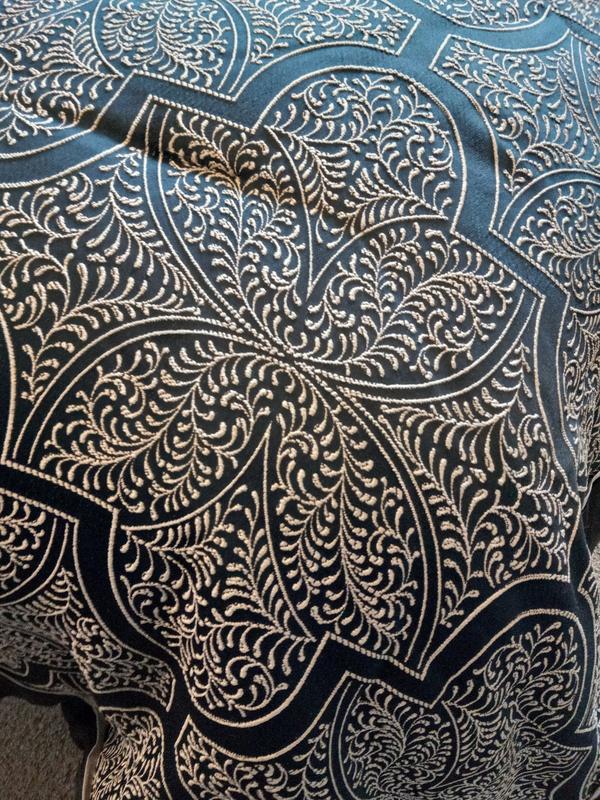 This comforter set definitely exceeded my expectations! Based on the pictures, I assumed that the pattern would be printed onto the material, but was happily surprised to find that it is ALL embroidered and very well made. Plus, the thread used in the embroidery takes on the colors of the room around it and can appear gold, silver, white, etc. The dark blue material is a hefty and almost tapestry feel, but still soft and plush without being super heavy. On the reverse is a solid soft blue material which feels great sleeping against it. A satin ribbon is sewn along the border and creates a great effect. Overall, this is a very luxurious, well made and quality set which I highly recommend! The only inconvenience I encountered was that the set is shipped in an air-vacuumed bag and was a bit wrinkled, but a quick steam iron made it look perfect.