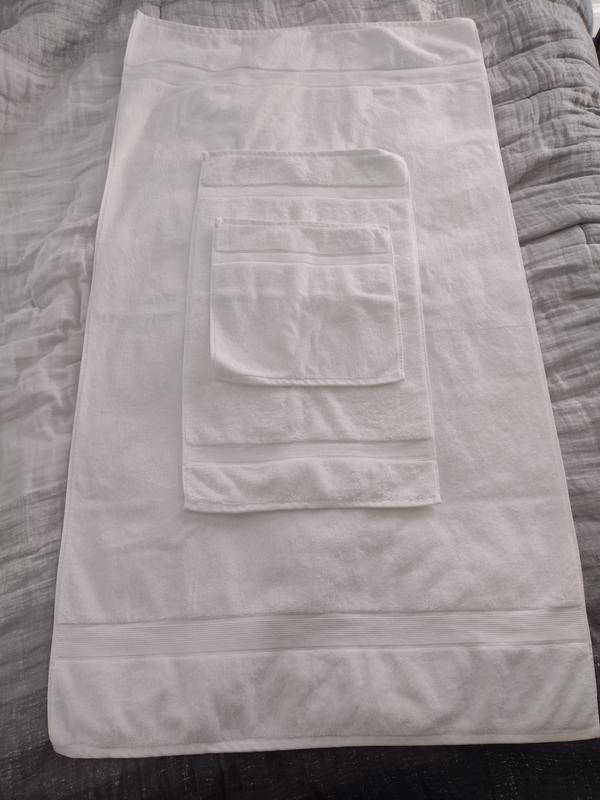 I love this antimicrobial 6 piece towel set. the design on the towels with the lines is very attractive. The towels are very soft and large in size. Best of all they wash great! They stayed soft after washing.
