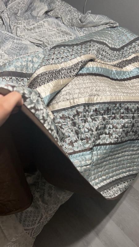 I received this quilt set for free in exchange for an honest review. I'm in love with the colors and pattern of this quilt set. It looks very elegant, and the blue and brown tones complement each other beautifully. The quilt itself is a nice thickness. It's not too bulky like a comforter, but very warm. The quality is excellent and I like how the fabric has a satin sheen to it. I have a queen size bed and the queen/full size was a great fit. Upon receipt I washed, and steamed it a bit and it came out great. No color bleeding, no weird fill clumping. Now it looks so classy in my room!
