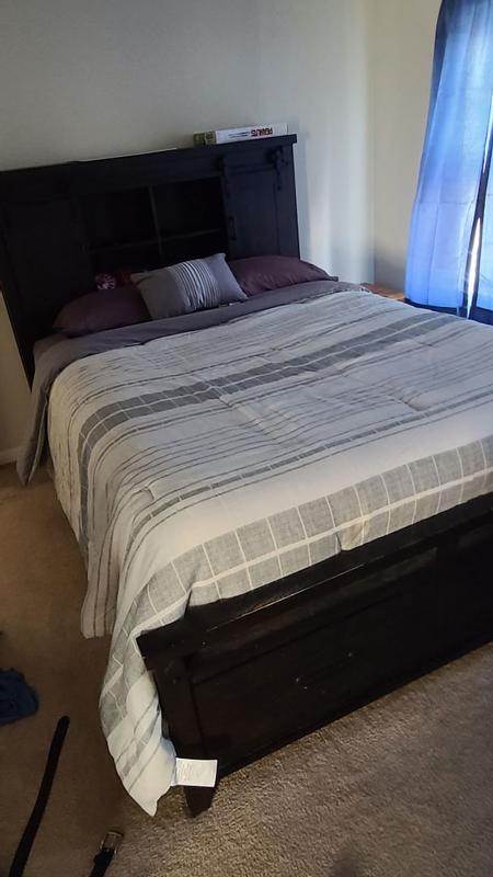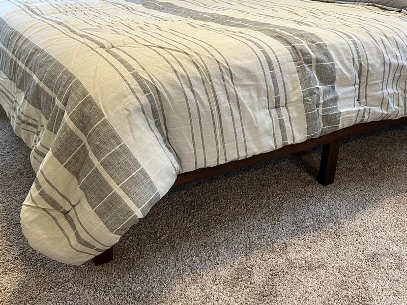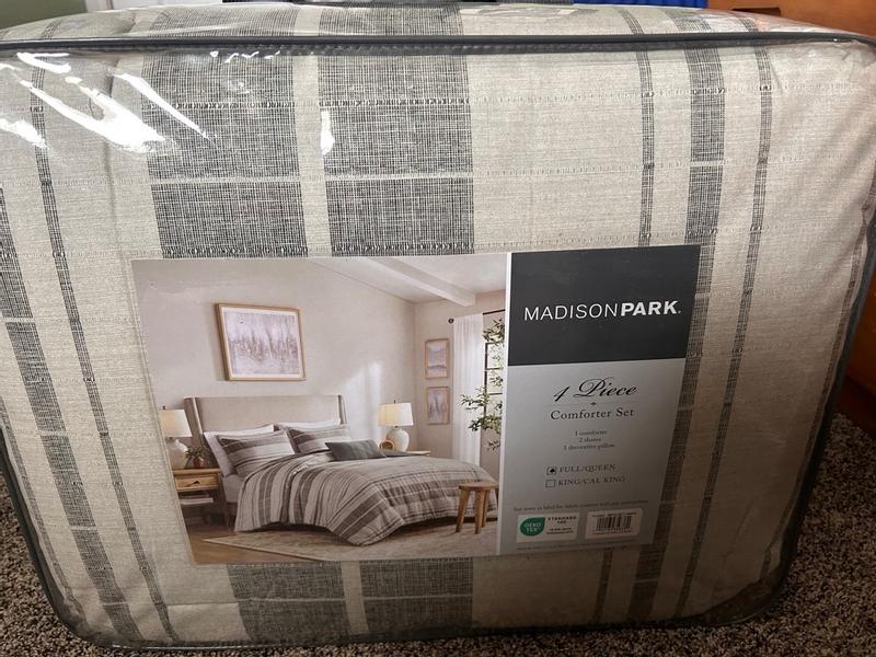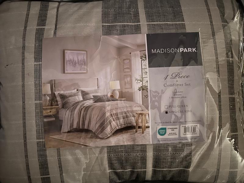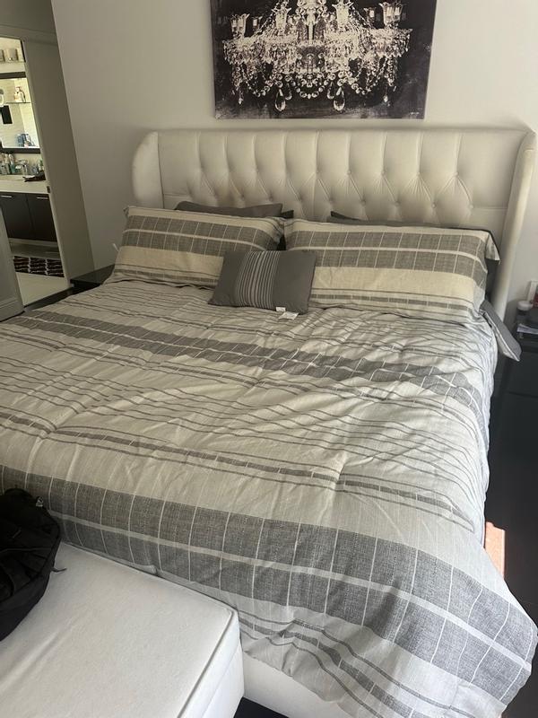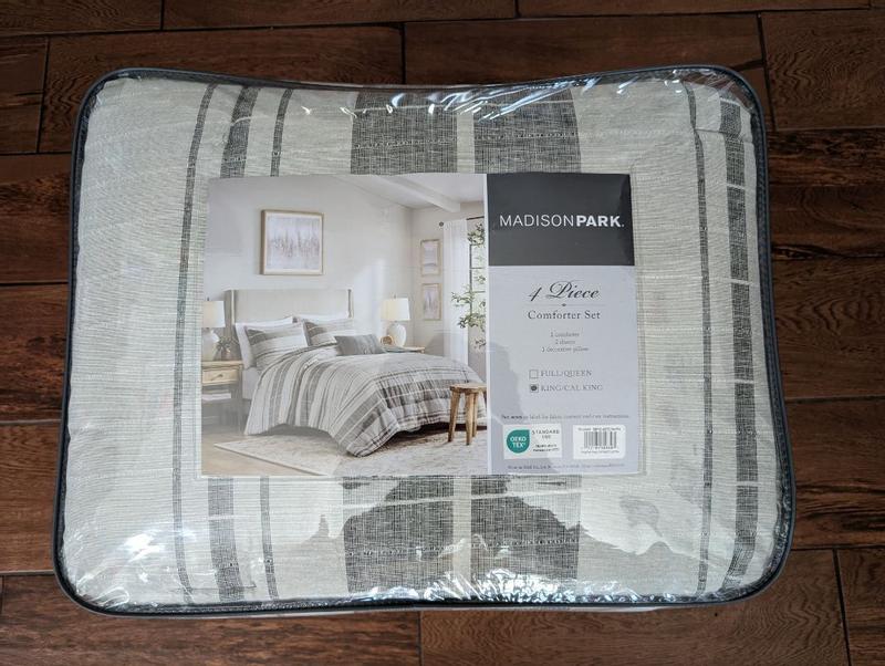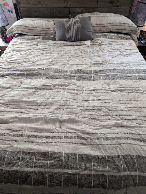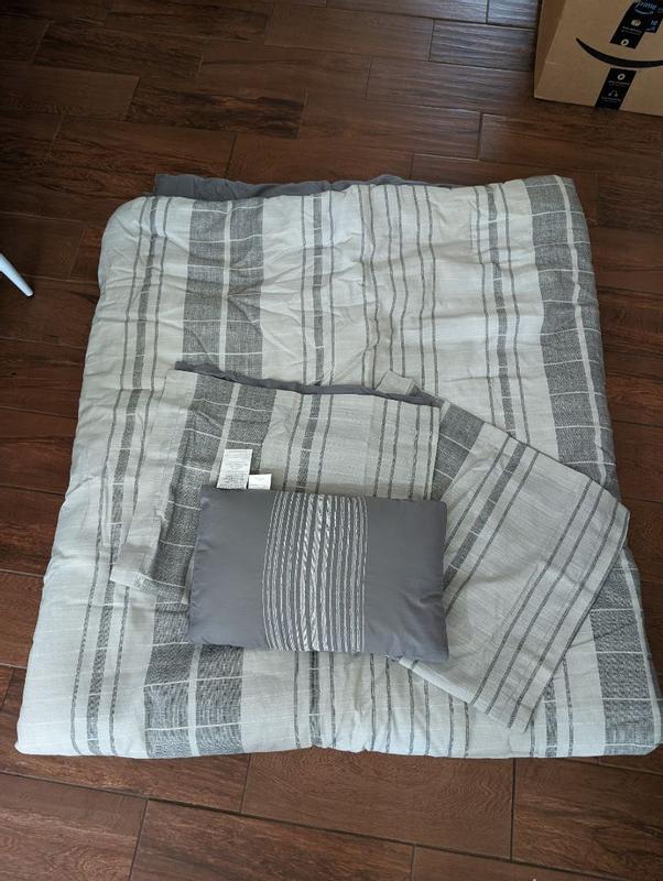 The Rhodes 4-Piece Stripe Comforter Set with Throw Pillow is a fantastic addition to any bedroom. This set features a sophisticated design with black stripes elegantly contrasted on a white and gray background, which adds a modern touch to my bedroom decor. The comforter and pillows are crafted from a high-quality cotton/poly blend. This combination not only enhances the softness and comfort of the bedding but also improves airflow, making it perfect for a good night's sleep. Additionally, the blend helps reduce wrinkles and significantly increases durability, ensuring the set looks brand new for a long time. The comforter has a lightweight feel but provides ample warmth, making it suitable for all seasons. The included throw pillow is a charming addition that ties the whole look together. It’s not only decorative but also quite comfortable for lounging. One of the best aspects of this comforter set is its machine washability. I've washed it multiple times already, and it holds up exceptionally well. The colors remain vibrant, and the fabric maintains its softness without pilling or losing its shape. The stitching is solid, and the overall construction is clearly of high quality, which is evident after each wash. The Rhodes 4-Piece Stripe Comforter Set with Throw pillow is an excellent choice for those seeking stylish, comfortable, and durable bedding. I highly recommend it.